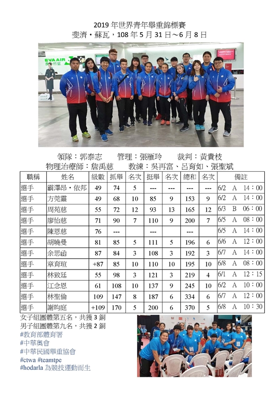 2019-09-27 / by ctwa / 未分類, 榮譽榜 / No Comments 2019年世界青年舉重錦標賽,斐濟‧蘇瓦,108年5月31日~6月8日 文章導覽 2019世界青少年舉重錦標賽,美國.拉斯維加斯,108年3月8~3月15日2019年世界舉重錦標賽9/18-9/27在芭達雅‧泰國舉行 2020年東京奧運會第二階段金牌資格賽 感恩有你們,一路相伴、支持打氣、加油。謝謝大家,我們會繼續堅持下去, 努力打拼爭取2020奧運最佳成績,有你們大家真好