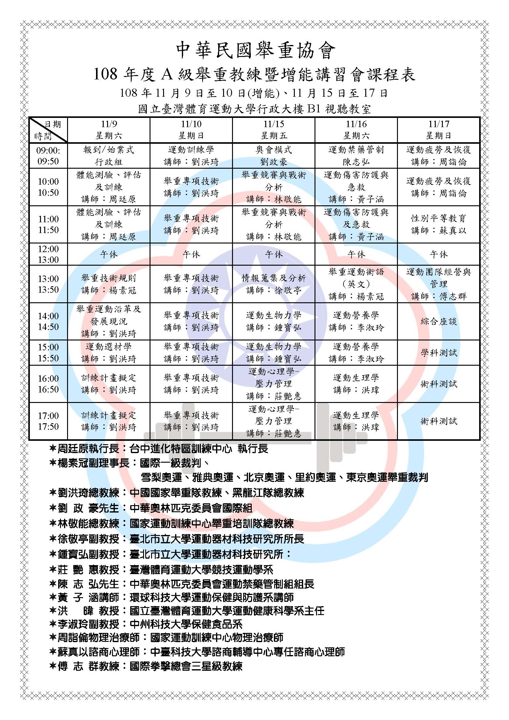 2019-11-01 / by ctwa / 最新消息, 講、研習公告 / No Comments 108年度A級舉重教練暨增能講習會課程表/學員名冊 文章導覽 「打擊非法運動彩券組織及防阻妨害賽事公平案件檢舉獎金」宣導海報【108年A級裁判昇等公告】