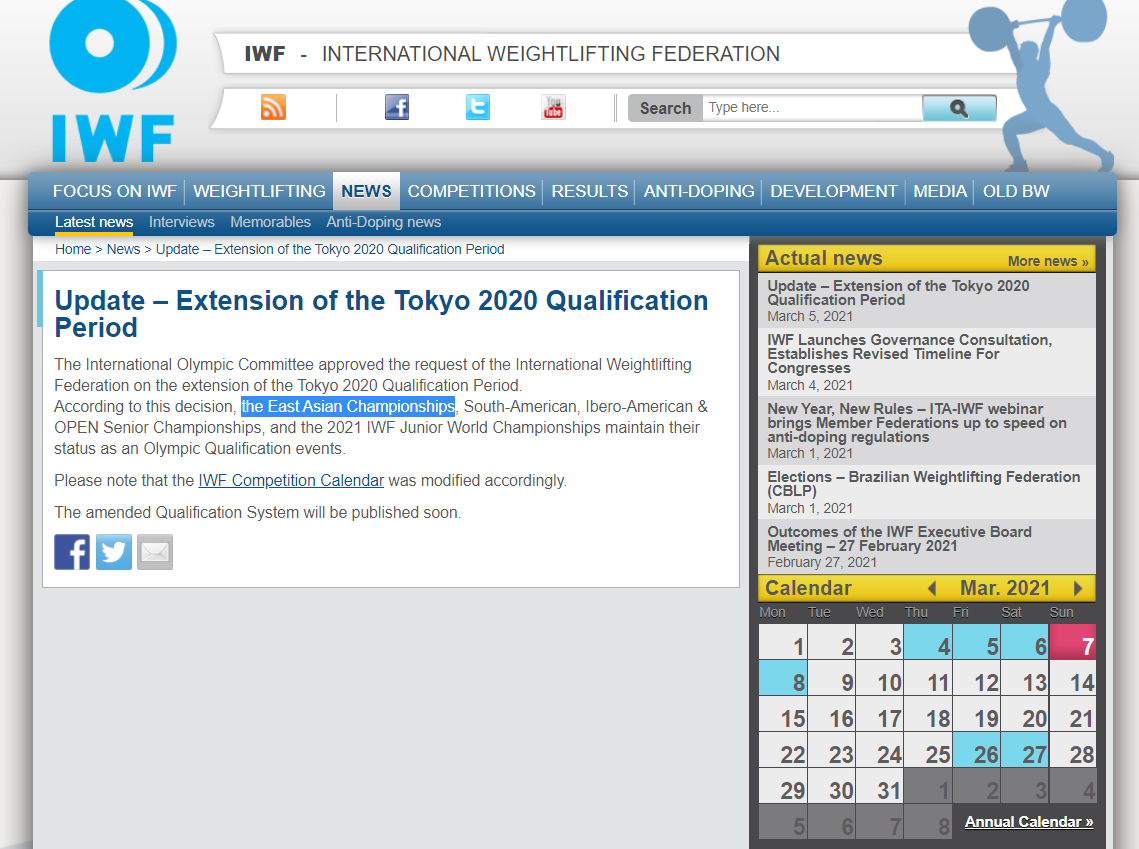 國際舉重總會(IWF)官方110年3月5日公告2021年第一屆東亞舉重錦標賽於韓國.首爾延期舉辦至2021年5月10-15日辦理(延期)。