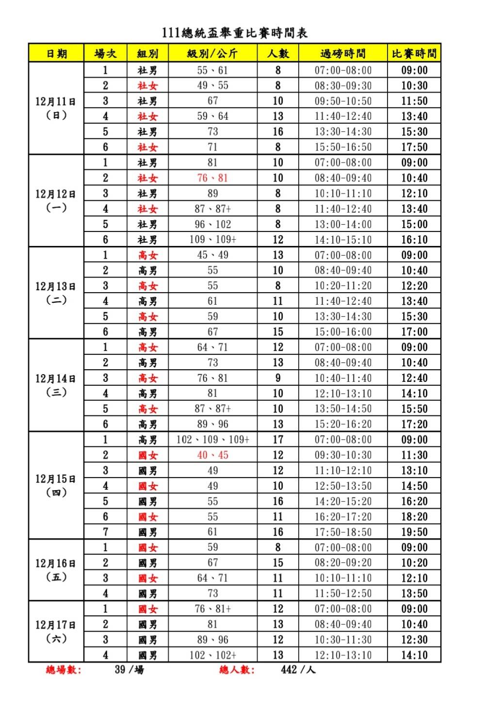 2022-12-07 / by ctwa / 國內外賽事公告, 最新消息, 最新訊息 / No Comments 111年全國總統盃暨精漢堂盃舉重錦標賽賽程表及參賽名單 比賽時間表 各組別參賽名單 12月10日下午兩點將舉行技術會議,結束後舉行裁判會議。 技術會議及裁判會議後,最終賽程將公佈於本會網站或FB。 文章導覽 修正賽事日期- 111年全國總統盃暨精漢堂盃舉重錦標賽教育部體育署辦理112年替代役體育役儲備選手