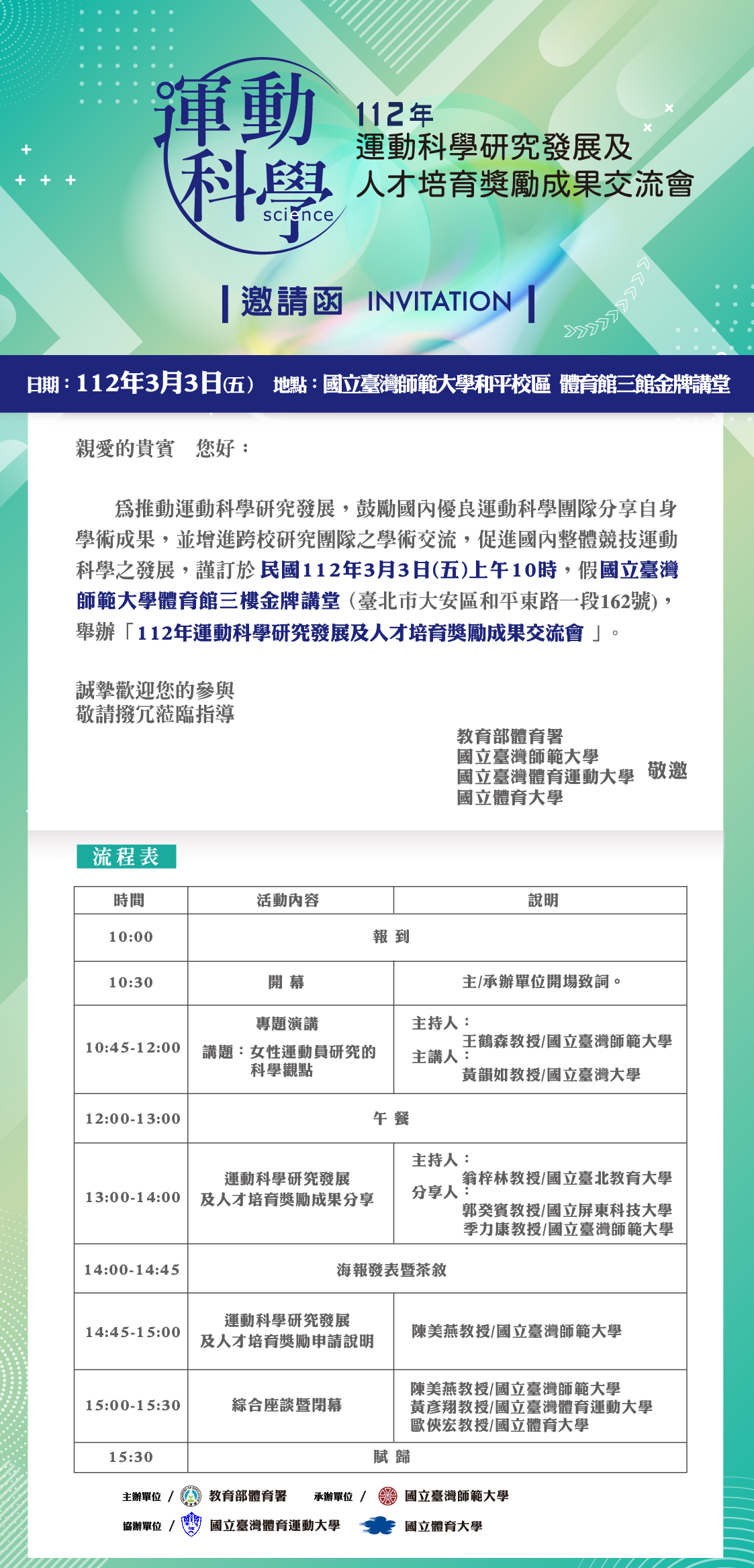 本次活動將邀 請 111年 運動科學研究 獎勵 獲 獎者進行 研究 分享 ,展現與交流成果 。 同時,邀請學者分享女性運動員研究, 提升大眾對女性運動員相關研究議題之關注,再者 ,擬邀請運科人員、選手、教練 與對運科研究應用有興趣者 等一同與會,並與現場學者及獲獎者進行分享及互動, 增進 運動科學研究學術之交流。