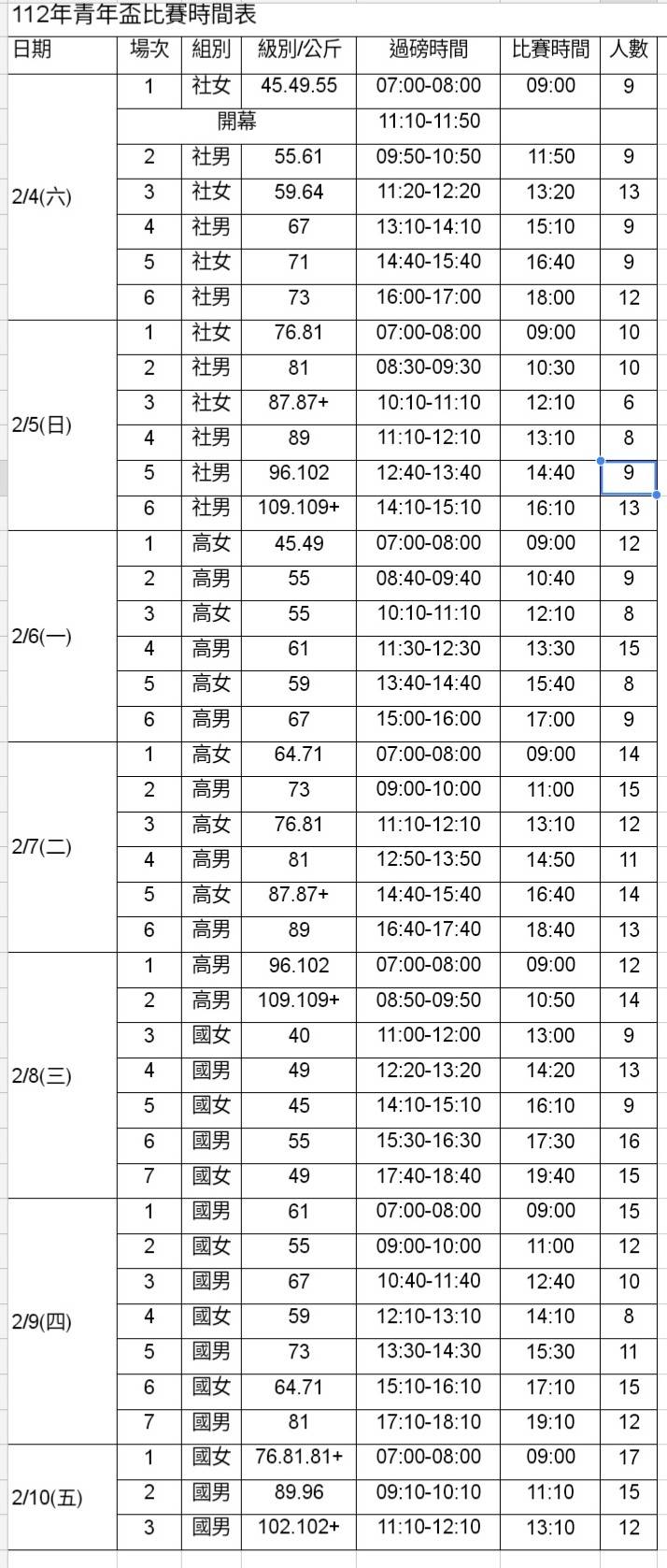 2023-02-03 / by ctwa / 國內外賽事公告, 最新消息, 最新訊息 / No Comments 112年全國青年盃暨精漢堂盃舉重錦標賽 比賽時間表及各組參賽選手名單 比賽時間表 社女組 社男組 高女組 高男組 國女組 國男組 文章導覽 【國際賽事選拔公告】2023年亞洲舉重錦標賽(5月3日至13日)(2024巴黎奧運會資格賽)2023年 IWF Anti-Doping Rules 修正版於2023年1月1日生效