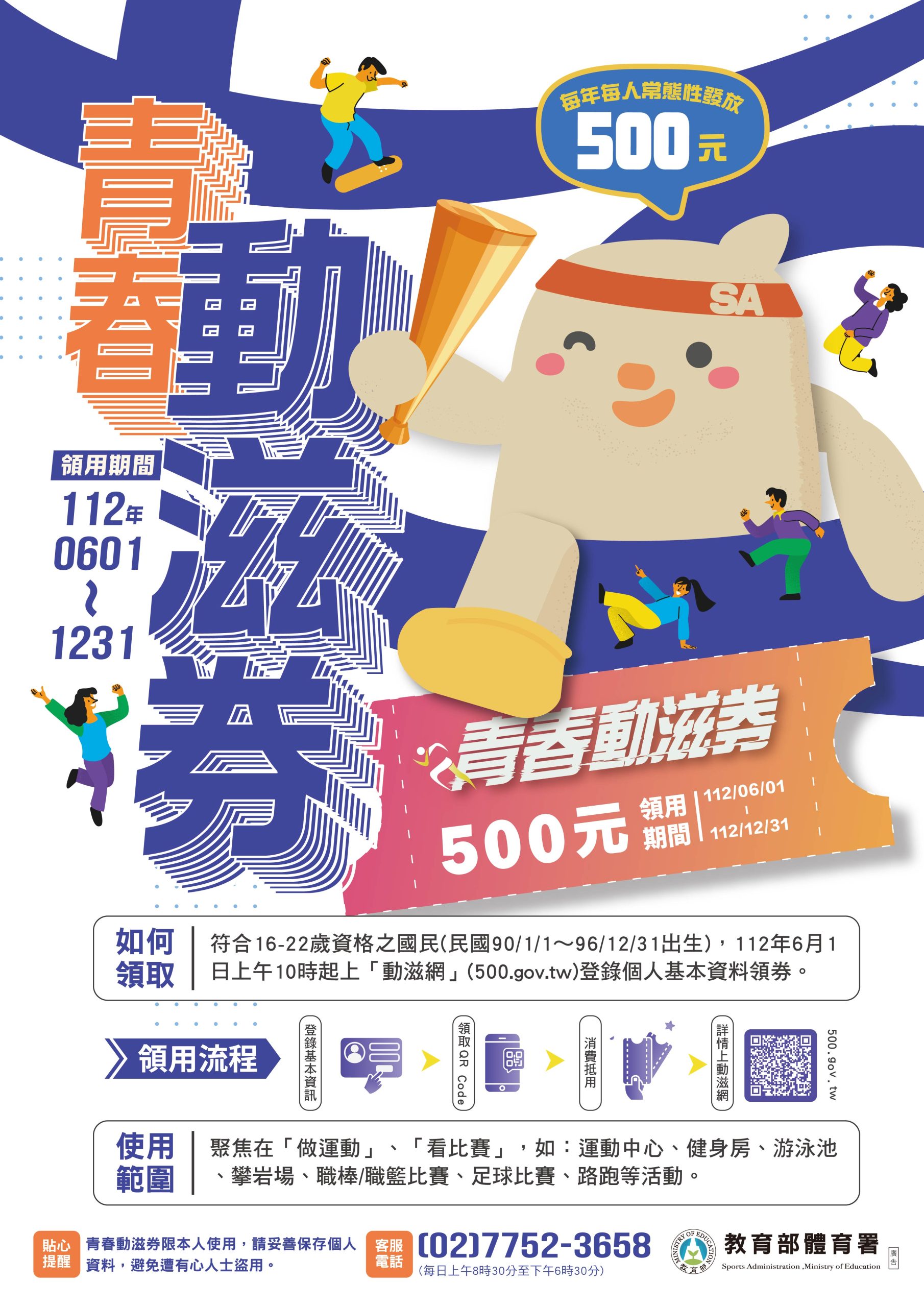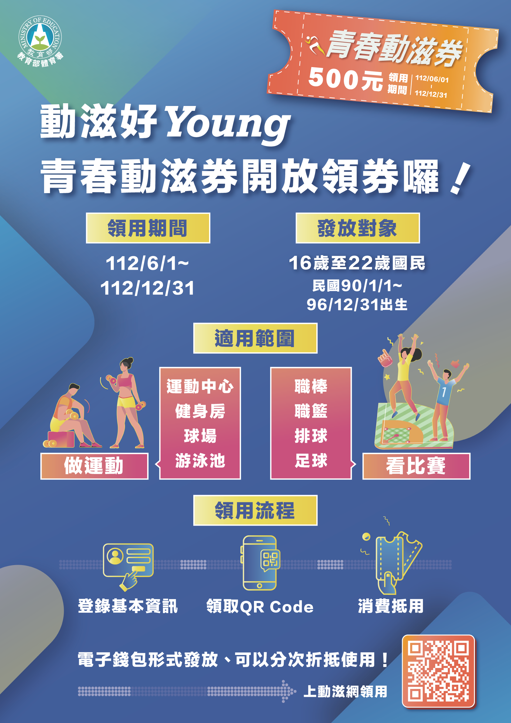 一、為延續動滋券成效,及鼓勵青年族群積極參與體育活動或觀賞賽事,讓運動成為伴隨青春歲月的美好回憶,規劃每年常態性發放16歲至22歲國民每人500元青春動滋券,相關規劃如下: