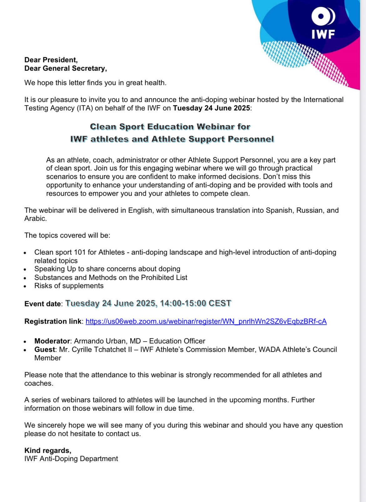 請注意:強烈建議所有運動員與教練參加本次線上研討會。